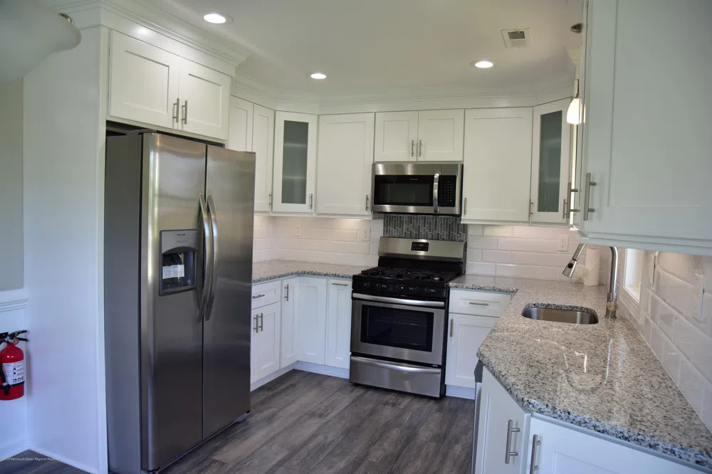 With this totally renovated and re-designed home, this is as close as you can get to the benefits of new construction, without new construction prices! The interior layout has been dramatically improved! To accommodate today's open concept Buyers, the wall between the kitchen eat-in area and the living room has been eliminated and the downstairs floorplan has been re-designed to allow for a more spacious bathroom! This gorgeous kitchen features white, 36 inch shaker cabinets with self- closing doors, crown molding, granite counters, a subway tile backsplash, and brand new stainless steel appliances. A huge picture window in the living room showcases the new patio and private backyard with 6 ft white vinyl fence. Sizzle features include under cabinet lighting, pendant l above the sink, ceiling fans, shadow boxes, recessed lighting, and even a wall safe! If you are tired of home repairs and tired of looking at houses with the same floor plans, then with this UNIQUE, totally renovated house, your search is finally over! This is not just another cape-style house with a converted garage that still looks like a converted garage. The floor plan was specifically designed to integrate the garage with the rest of the house by moving the front door, adding exterior siding, adding a coat closet, and adding a tiled foyer. When you're not enjoying all the luxury features in your one-of-a-kind house, relax on your new patio, watching your kids play in the privacy and security of your fenced in yard.